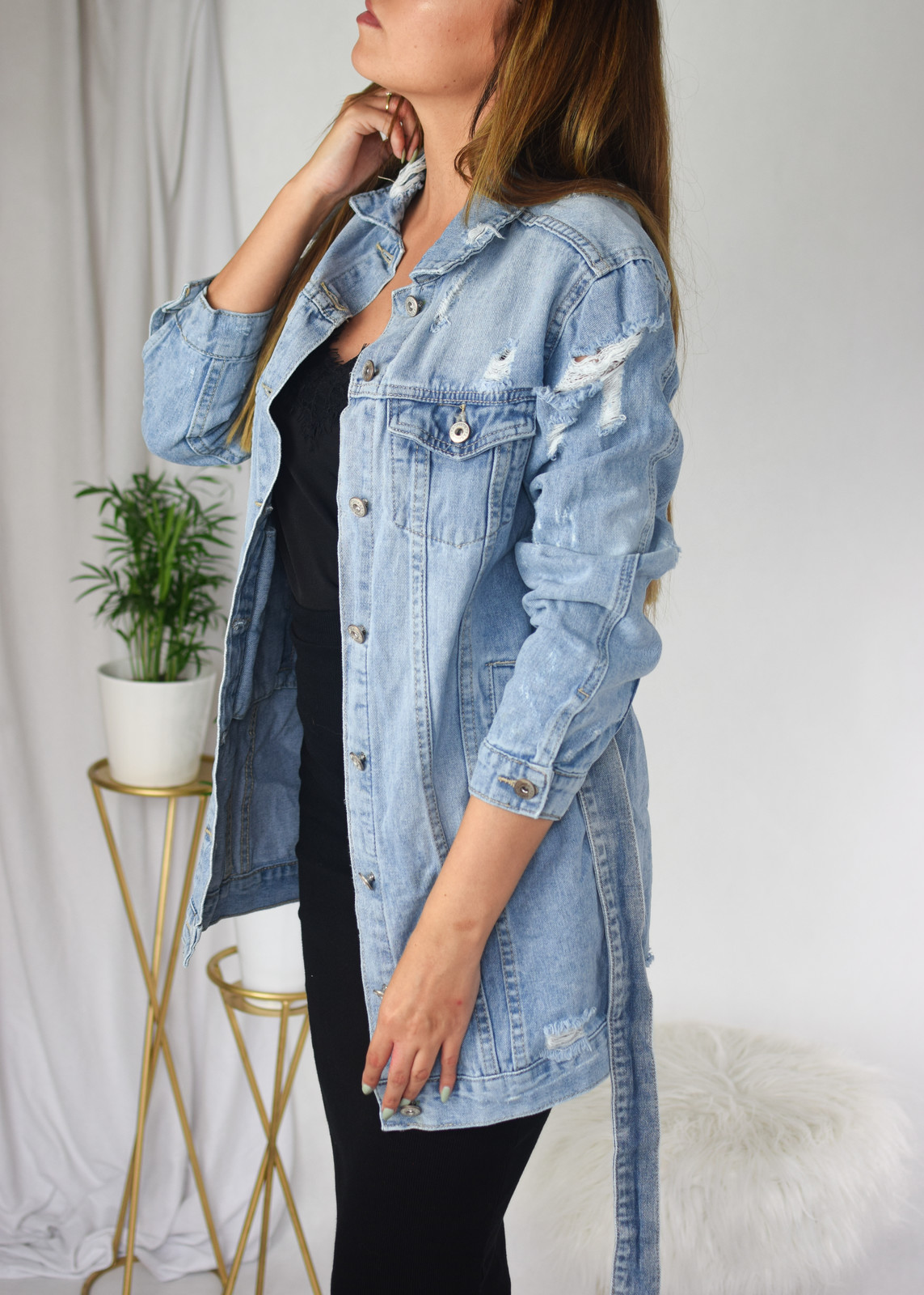 SB-0720-0155Długa kurtka jeansowa to HIT ostatnich sezonów. Pasek daje możliwość podkreślenia talii. Idealna w zestawie z spodniami, spódnicą lub prostą sukienką, Kurtka posiada przetarcia, co dodaje jej charakteru, a stylizacjom nowoczesności.