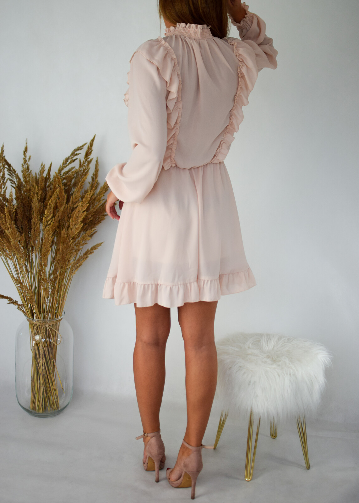 SB-0920-0119Piękna szyfonowa sukienka z długim rękawem zakończonym gumką i falbanką. Sprawdzi się na jesień, na co dzień, ale także na wjątkową okazję, zależnie z jakimi butami ją zestawisz. Prosta i elegancka, ale bardzo praktyczna. Uroku dodaje jej wiązanie pod szyją.