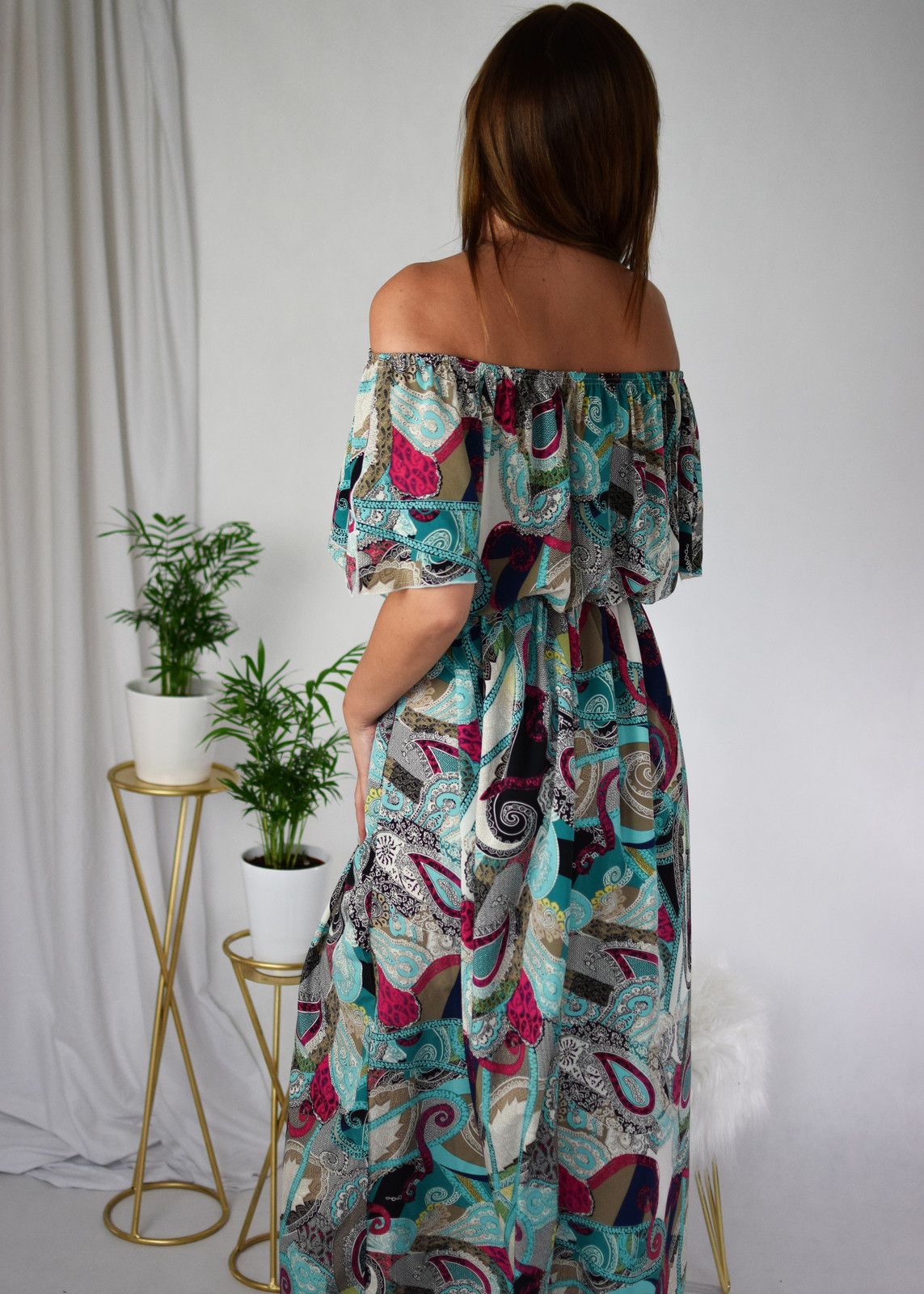 SB-0720-0067Długa sukienka hiszpanka z rękawkami w niebanalny wzór. W pasie i dekolcie znajduje się gumna, dzięki której sukienka dopasowuje się do figury i będzię odpowiednia na S-XL. Luźny, lekki fason sprawdzi się w ciepłe dni, a modny print przyciągnie uwagę.
